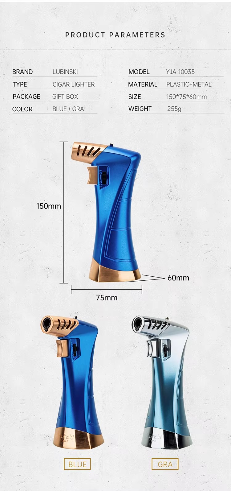 Home    Cigar Lighters    Lubinski Metal Gas Table Torch Jet Flame BBQ Cigarette Lighters Cigar Lighter With Gift Box YJA-10035